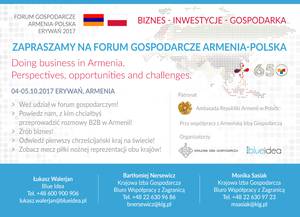 Forum gospodarcze „Armenia jako most pomiędzy Unią Europejską a Euroazjatycką Unia Celną" odbędzie się 4 października i będzie doskonałą okazją do zapoznania się z aspektami prowadzenia biznesu w najstarszym chrześcijańskim kraju. Wśród prelegentów znajdą się reprezentanci wybranych resortów z obydwu państw, a także specjaliści i praktycy biznesu. Zwieńczeniem Forum będą rozmowy B2B pomiędzy polskimi i ormiańskimi przedsiębiorcami. 5 października planowanie są dalsze spotkania B2B, zwiedzanie Erywania oraz uczestnictwo w meczu eliminacyjnym do Mistrzostw Świata w piłce nożnej Armenia -Polska.