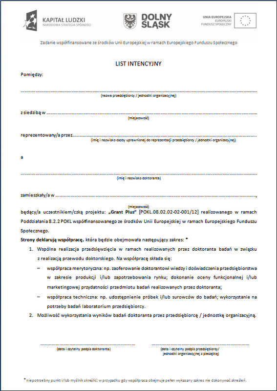 Informujemy, że stypendyści, którzy będą kończyć udział w projekcie Grant Plus, zostaną zobowiązani w sprawozdaniu końcowym opisać zadeklarowany w Liście intencyjnym zakres współpracy. W ramach tego opisu trzeba będzie krótko zrelacjonować w jaki sposób przebiegała współpraca z przedstawicielem gospodarki w okresie uczestnictwa w projekcie.