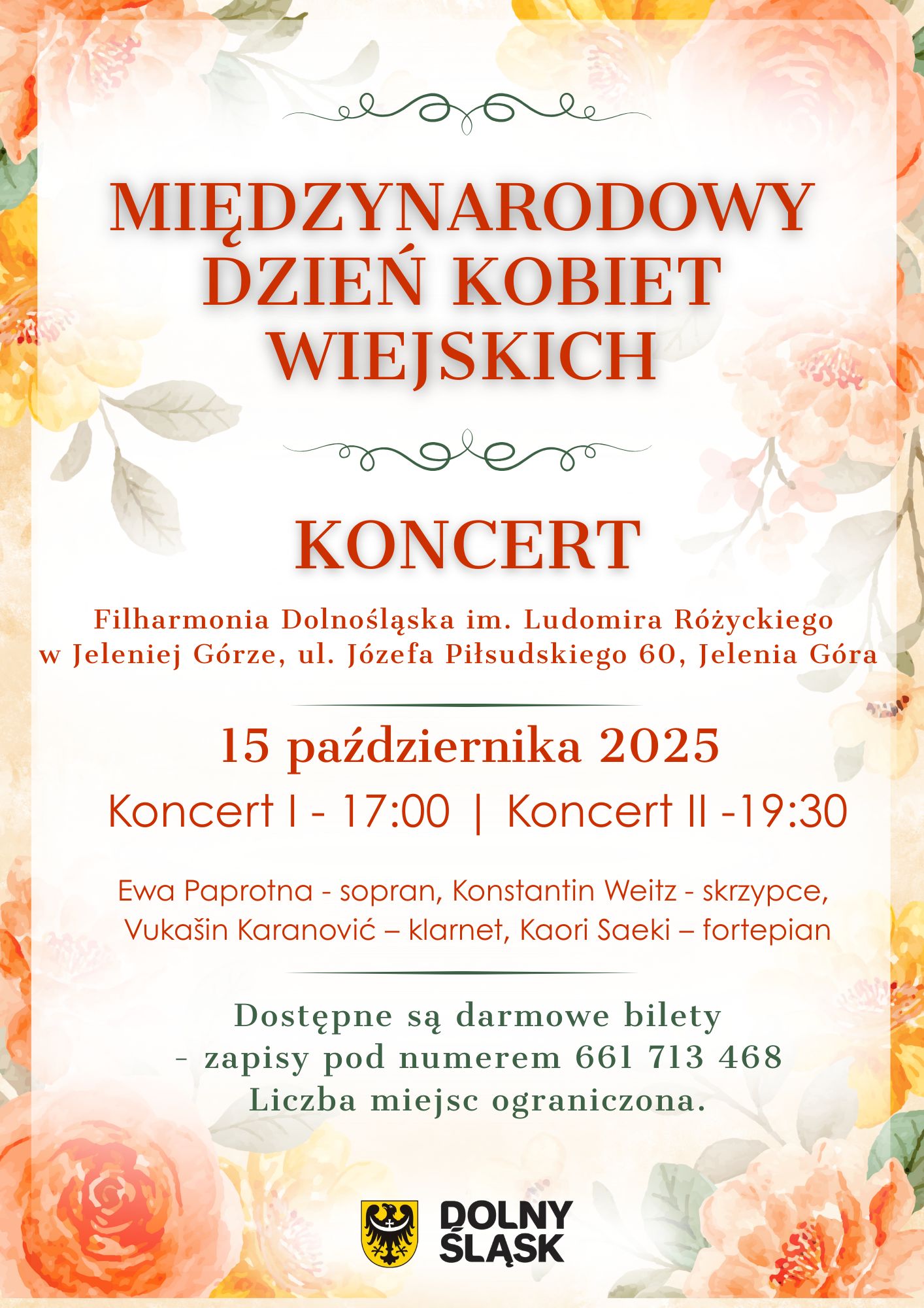 Darmowe bilety można rezerwować do 12.10.2025 r. pod numerem 661 713 468. Można wziąć udział tylko w jednym koncercie. Liczba miejsc jest ograniczona.