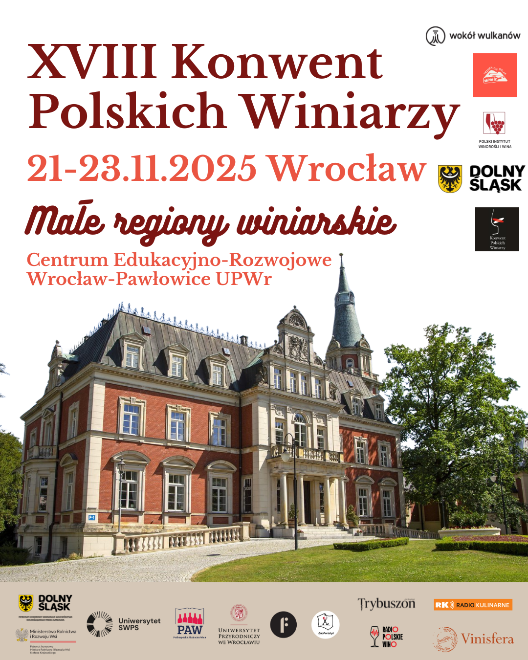 W dniach 21–23 listopada 2025 roku we Wrocławiu odbędzie się XVIII Konwent Polskich Winiarzy – jedno z najważniejszych wydarzeń branżowych w Polsce, poświęcone rozwojowi winiarstwa i współpracy regionalnej. Tegoroczna edycja odbędzie się pod hasłem „Małe Regiony Winiarskie” i skupi się na roli mikroregionów w budowaniu tożsamości polskiego wina.